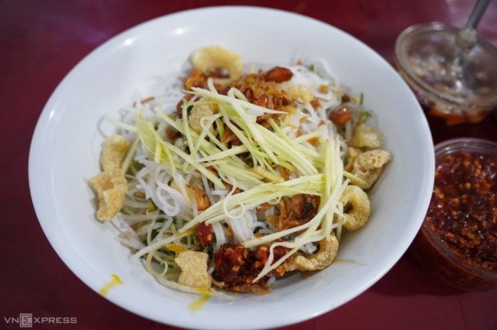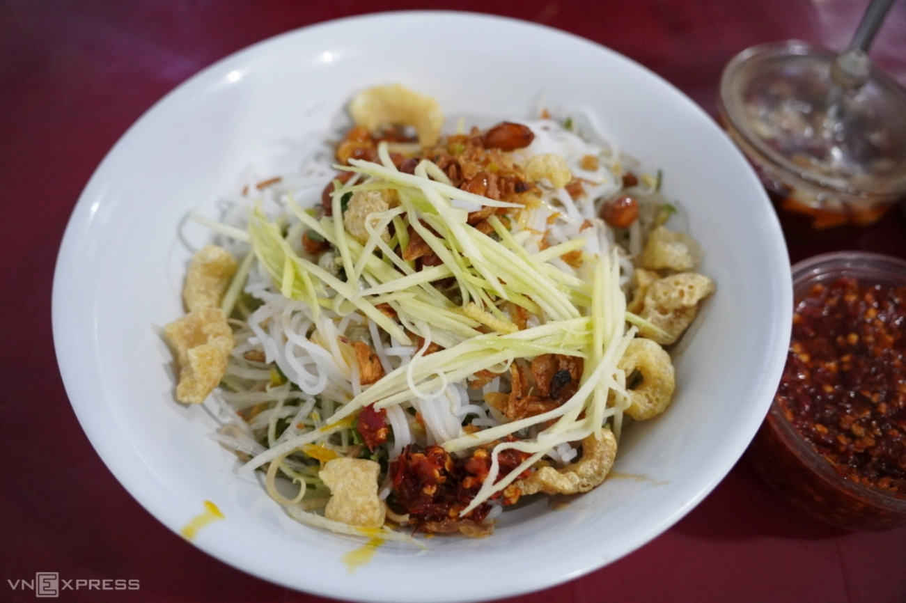 Món ăn được chan nước sốt nấu từ măng chua, gạch tôm và nhiều loại gia vị theo công thức gia truyền. Topping gồm nuốc, ram chiên, tôm, rau sống. Khi thưởng thức, thực khách có thể thêm mắm ruốc và ớt tươi xay để tăng hương vị. Mỗi tô có giá 35.000 đồng. Ảnh: Minh Thảo