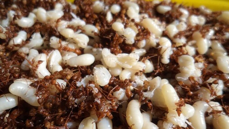 Cá suối to được róc thịt, loại bỏ xương, da rồi băm nhuyễn với sả, ớt và đựng trong chiếc tô lớn. Sau đó, rung cành cây để kiến vàng từ tổ rơi vào trong tô, đàn kiến sẽ cắn thịt cá và tiết ra dịch để làm chín cá. Sau nửa tiếng, cho thêm trứng kiến đã làm sạch vào, trộn đều các nguyên liệu vắt khô nước là xong. Món này thường được dùng với các loại lá gia vị hoặc lá sung, ăn vừa ngọt vừa cay nên rất được nhiều du khách yêu thích.