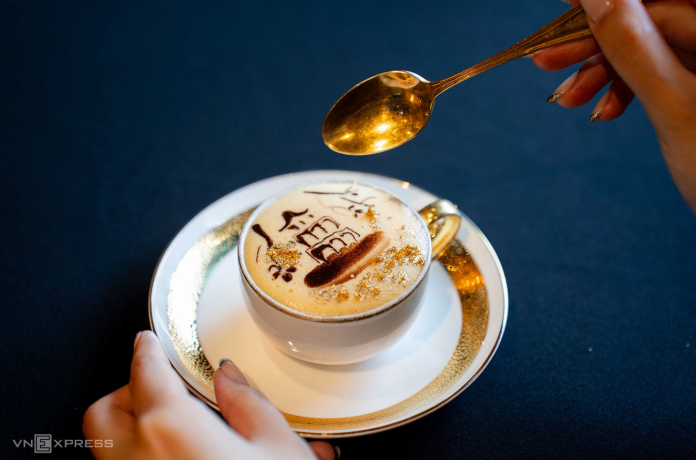 Một cốc cà phê dát vàng tại Hà Nội có giá 150.000 đồng, được phục vụ với cốc, thìa và đĩa dát vàng 24k ở viền.