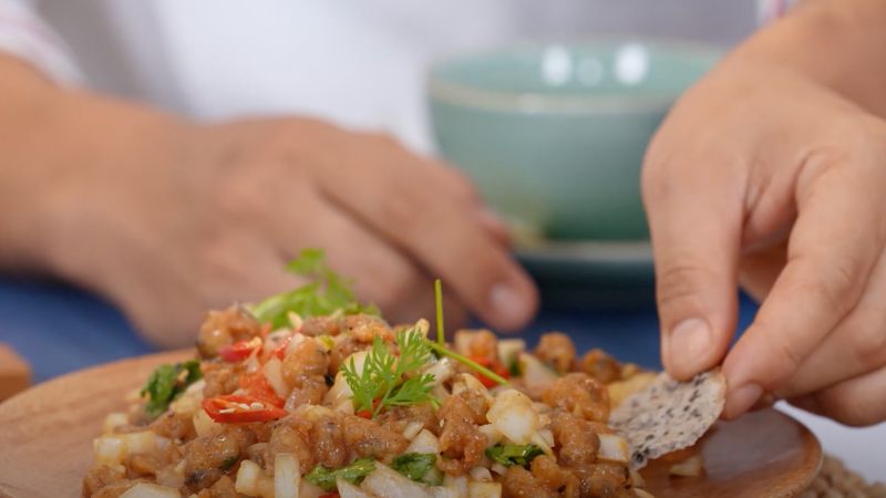 Bạn cho nghêu đã chiên giòn vào trong tô hành tây, tiếp theo cho thêm ít ngò rí, nước sốt sa tế và trộn đều là đã có thể bày ra thưởng thức.