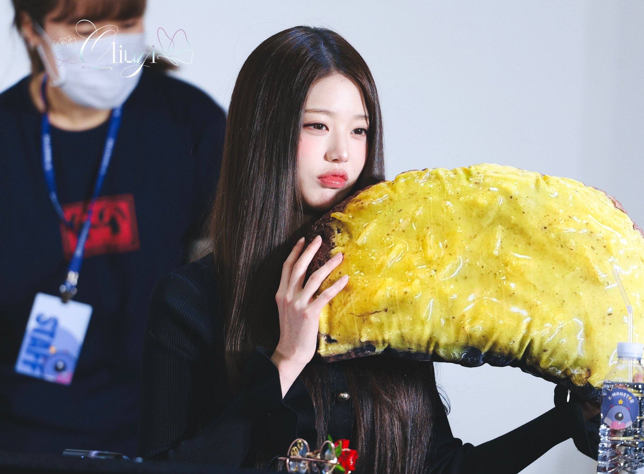 Jang Won-young – thành viên nhóm nhạc Ive, đem chiếc bánh “Dubai chewy cookie” siêu to khổng lồ đến fansign để chiều lòng fan.