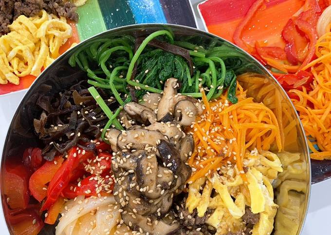 Các loại rau củ rửa sạch, thái sợi theo định lượng trên phần nguyên liệu. Bạn có thể gia giảm các loại rau củ theo sở thích của bản thân. Bạn cho 2 muỗng dầu ăn vào chảo, đến lúc dầu nóng bạn cho tỏi vào phi thơm, đến khi tỏi thơm bạn cho cà rốt, hành tây, ớt chuông, mộc nhĩ, nấm vào xào chín. Khi xào bạn cho thêm 1 muỗng nước tương để rau củ được đậm vị hơn.