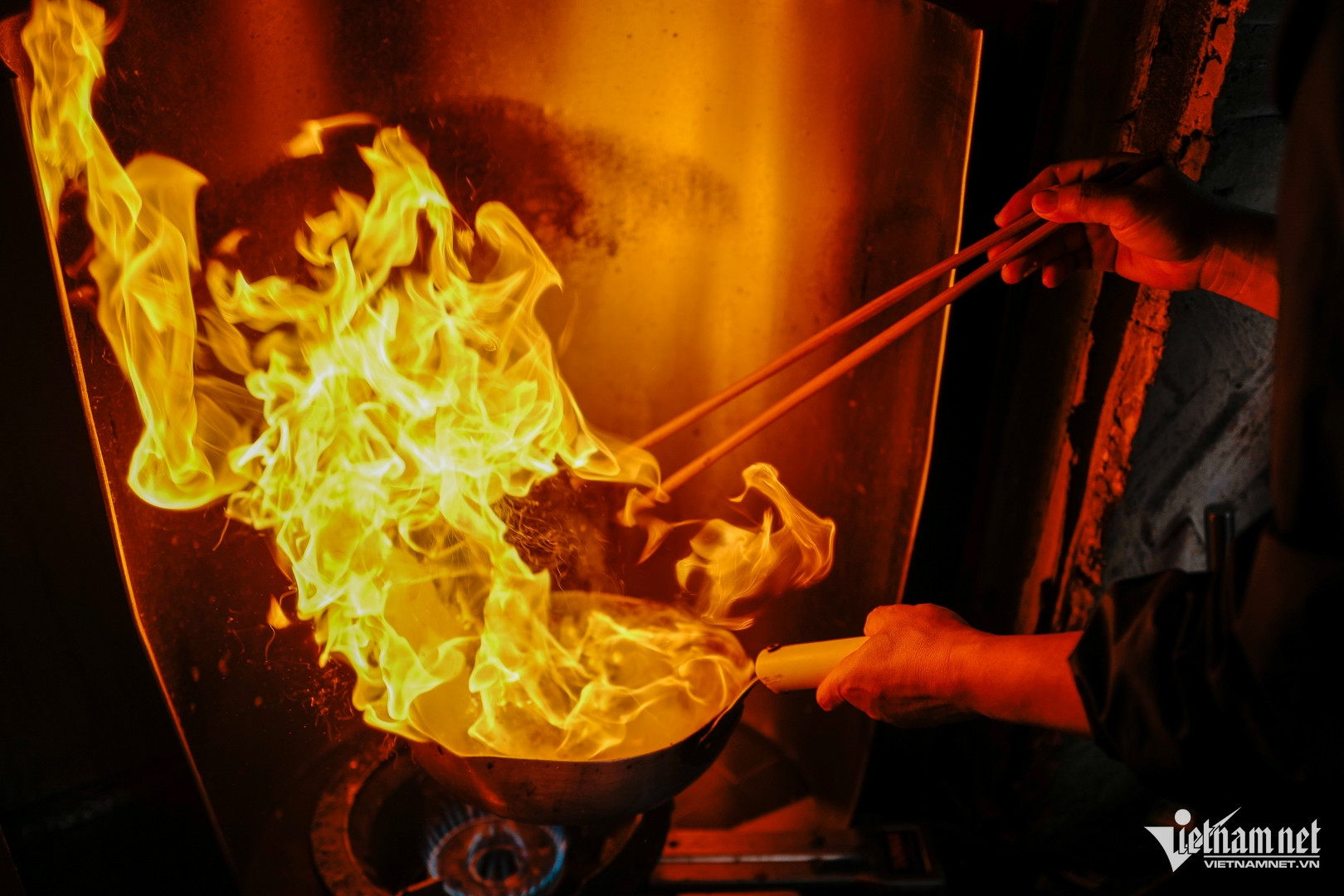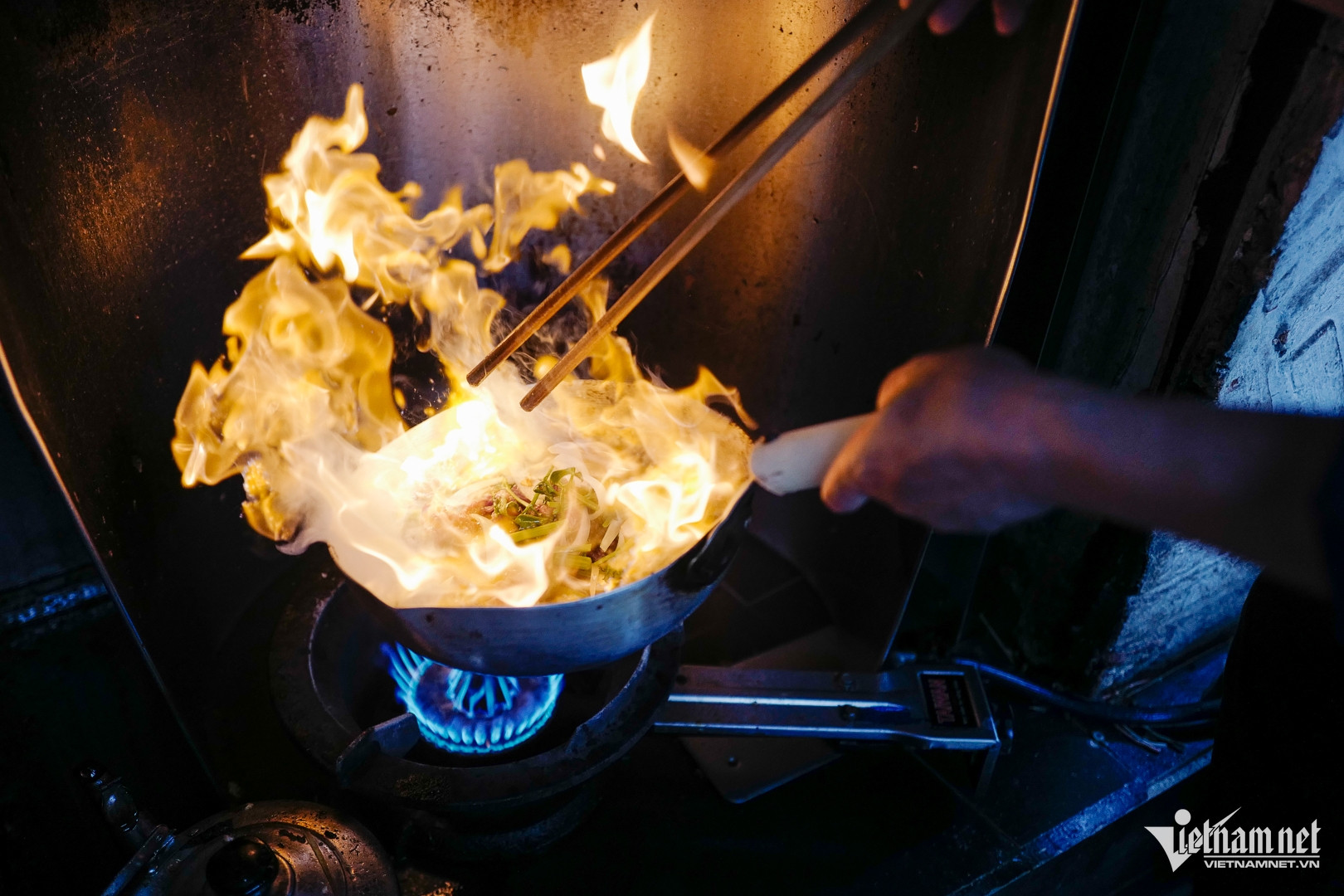 Từ góc quán phở, mùi tỏi bén lửa tỏa ra thơm phức. Người đầu bếp nhanh tay đảo từng mẻ bắp bò tươi rói trong chiếc chảo nhỏ sâu lòng, phát ra tiếng xèo xèo vui tai và ánh lửa bốc lên thu hút ánh nhìn.
