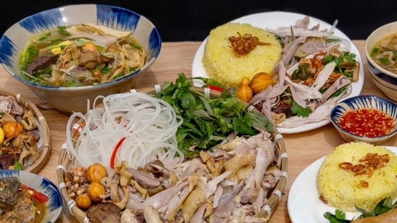 Menu: Lẩu gà lá é, chả ram tôm đất, mực chiên nước mắm, nem chua, chân gà sả tắc, chả ớt xiêm…